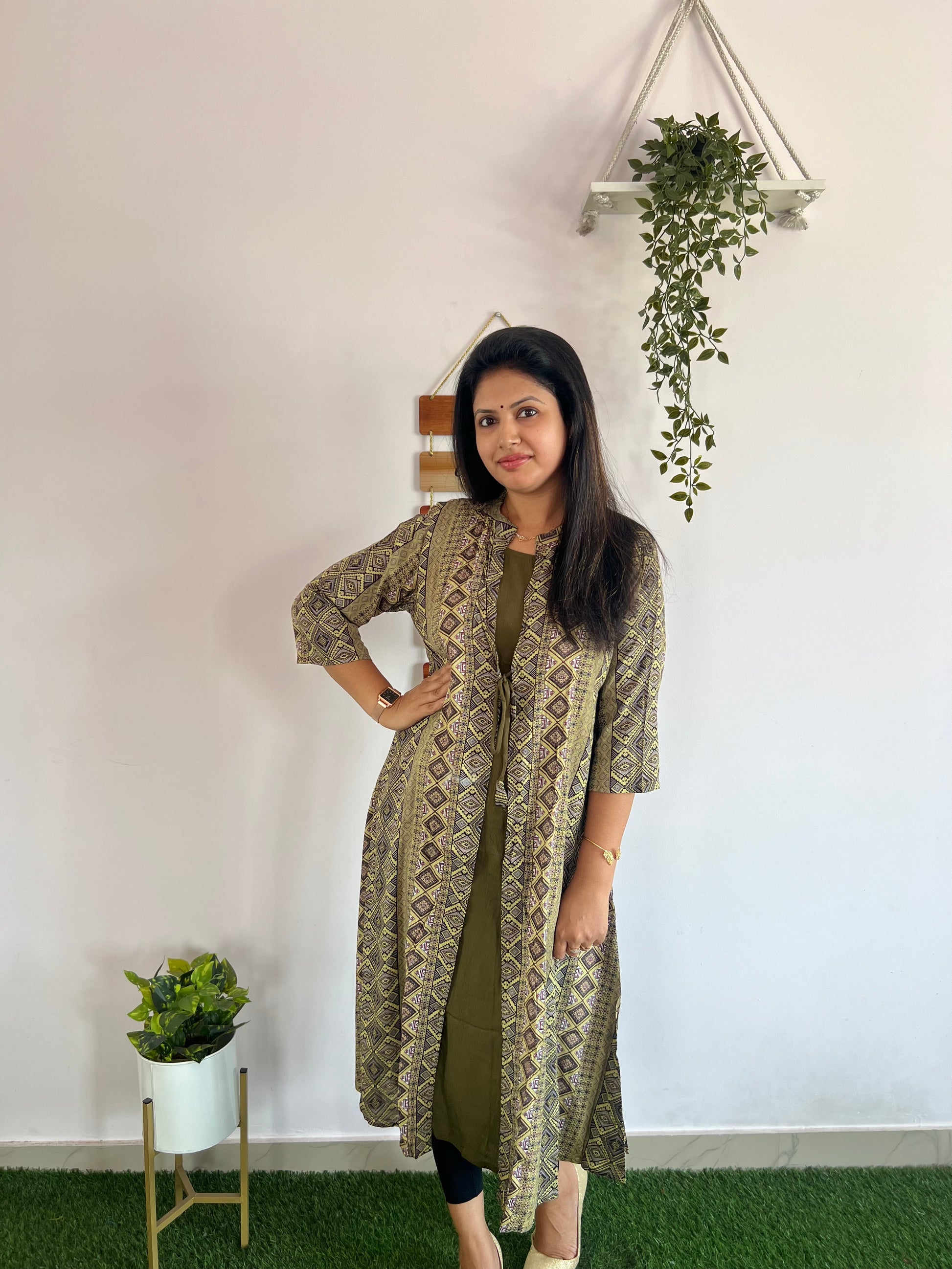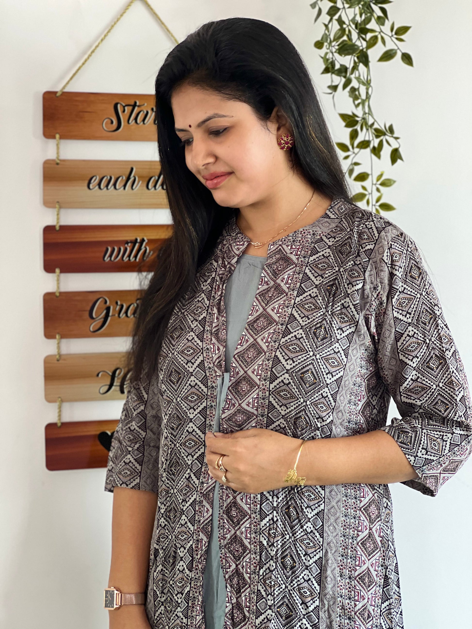 Wrinkle Rayon Feeding Dress with Attached long Jacket with Feeding zips on both the sides.