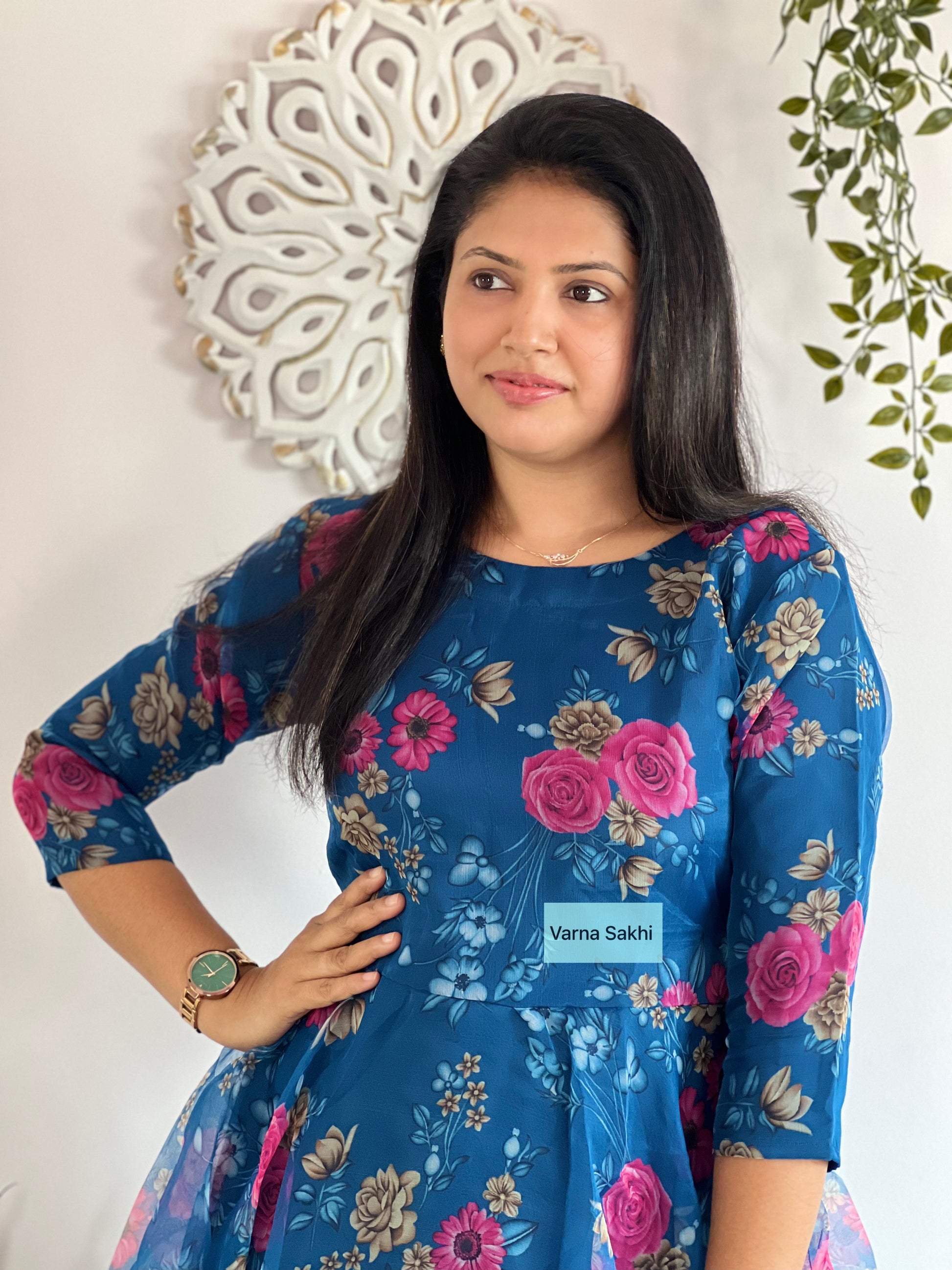 Organza Party Wear Gown with lining in body.. Back zip and Back knot present..