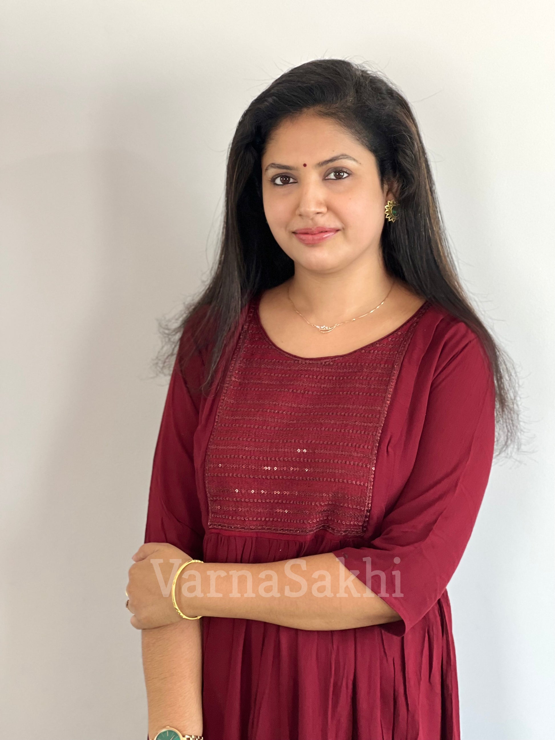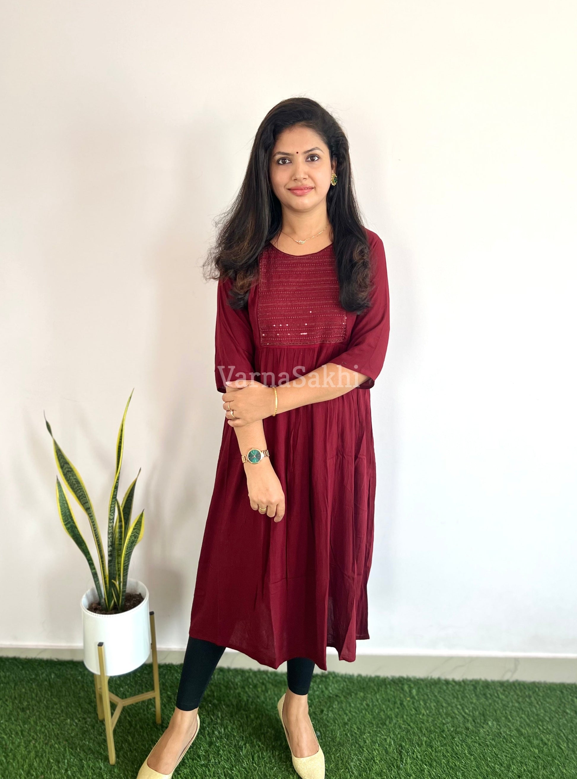 rinkle Rayon Feeding Dress with Concealed feeding zips with out lining. Sequence work on Yoke