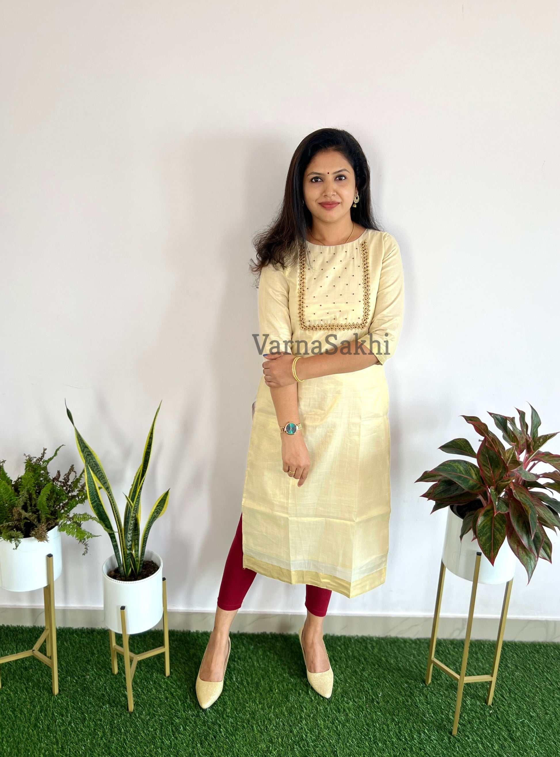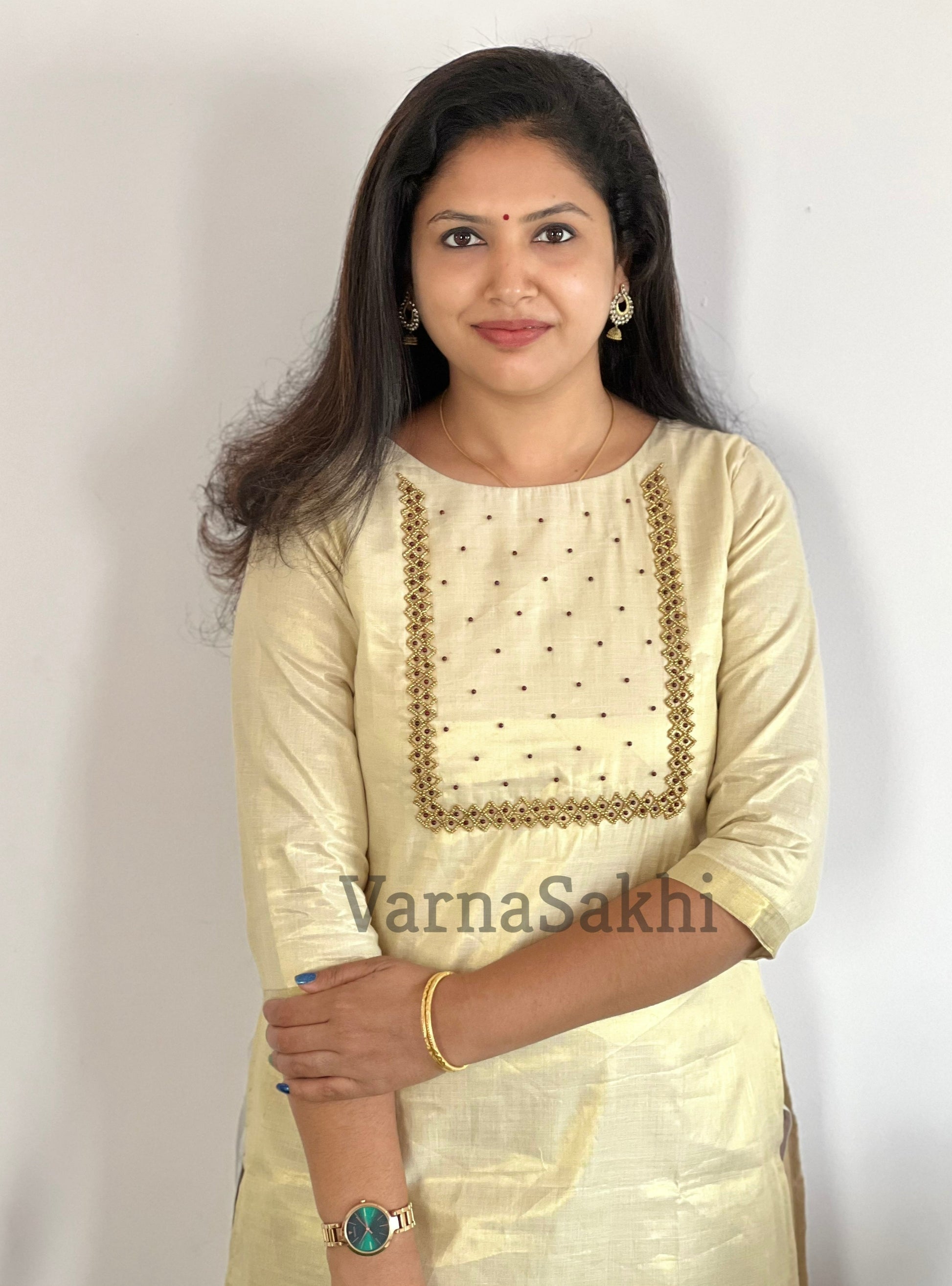 Tissue Silk kurta with hand work on Yoke and lining and side slit. Lining not on sleeves.