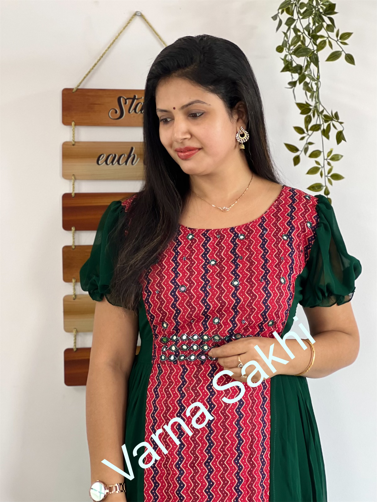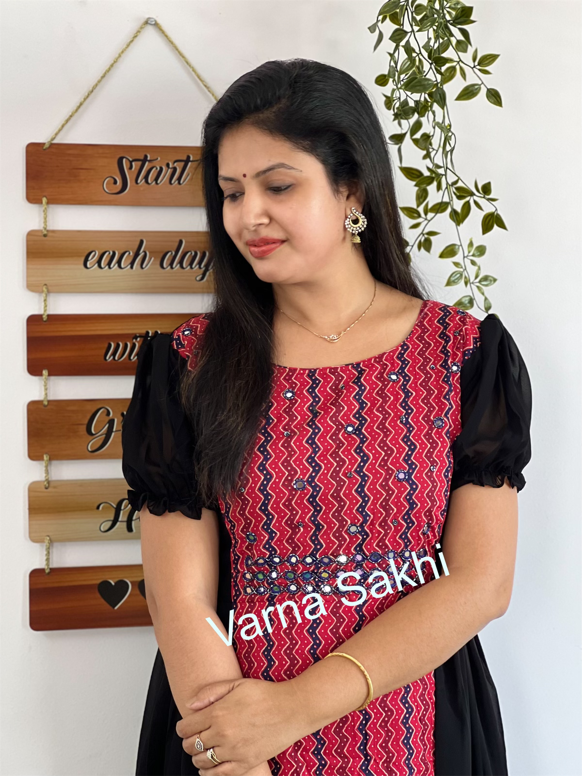 Georgette Dress with cotton patchwork at middle with mirror work and with short puff sleeves and back knot