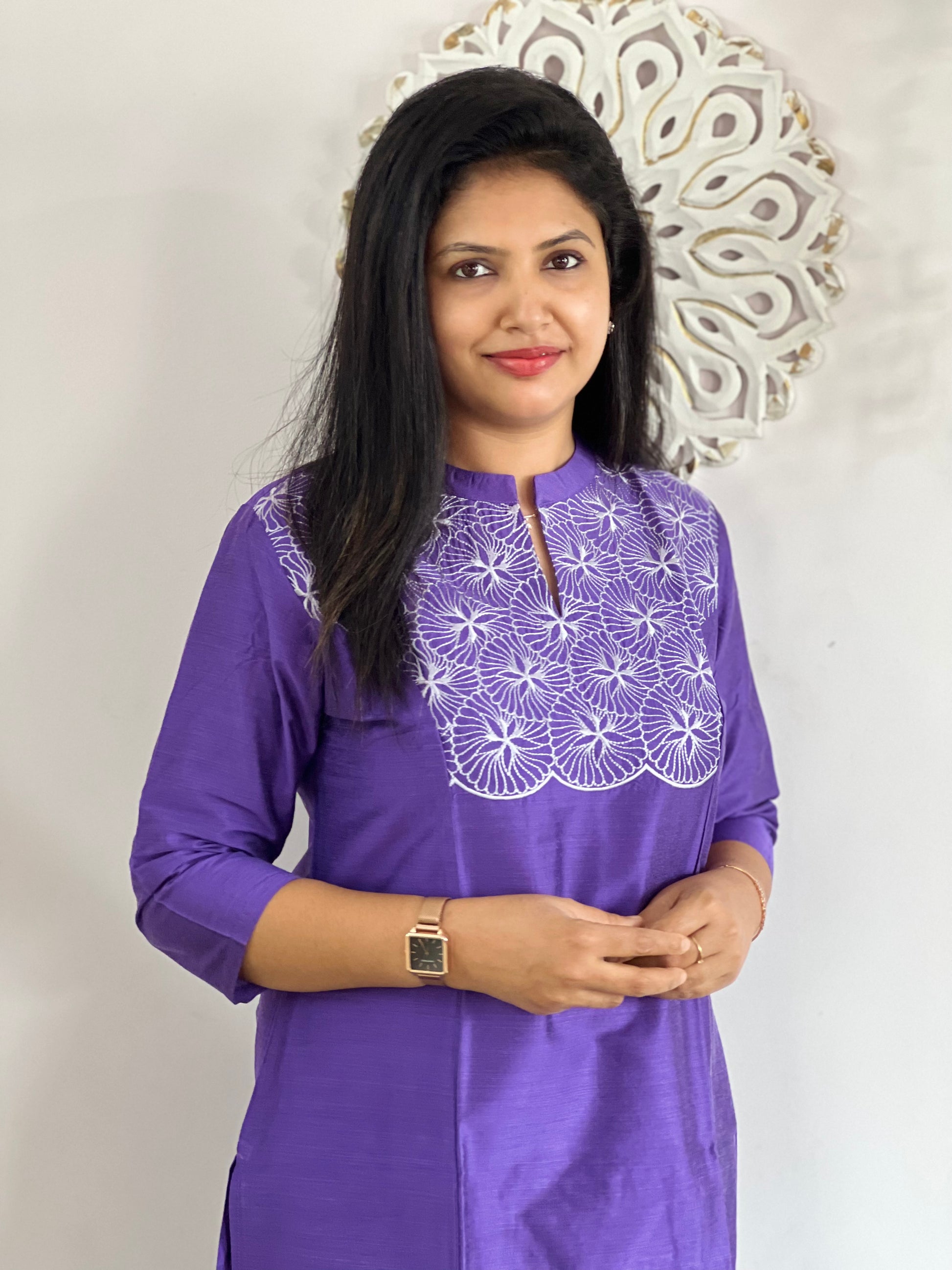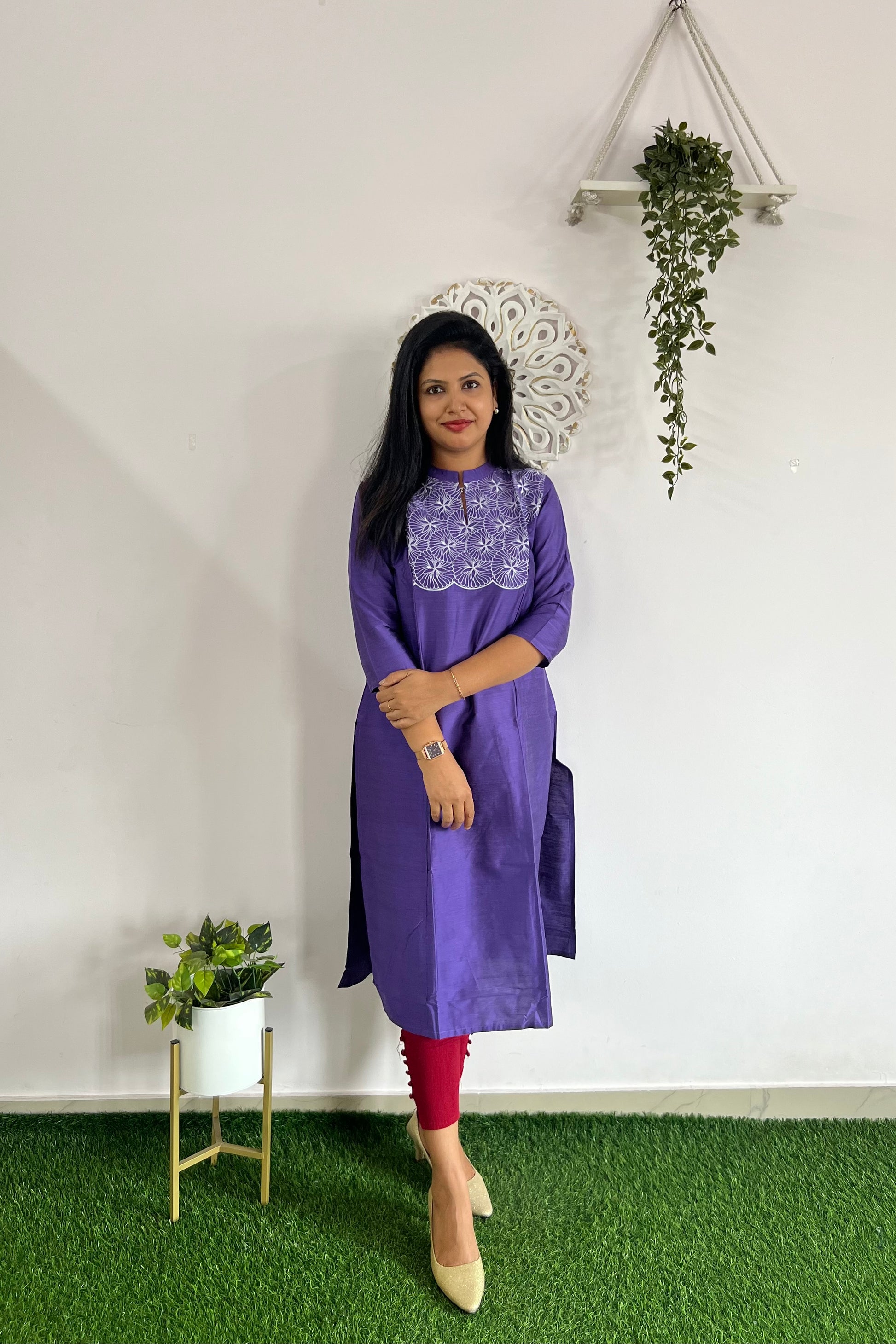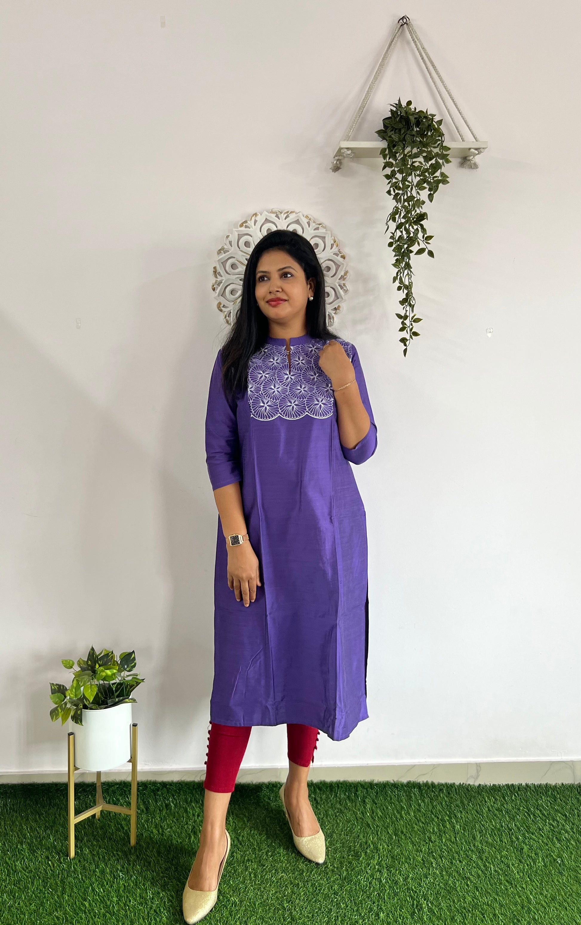 Premium brand slub cotton kurta with heavy embroidery on yoke,with mandarin collar,with side slit and without lining..