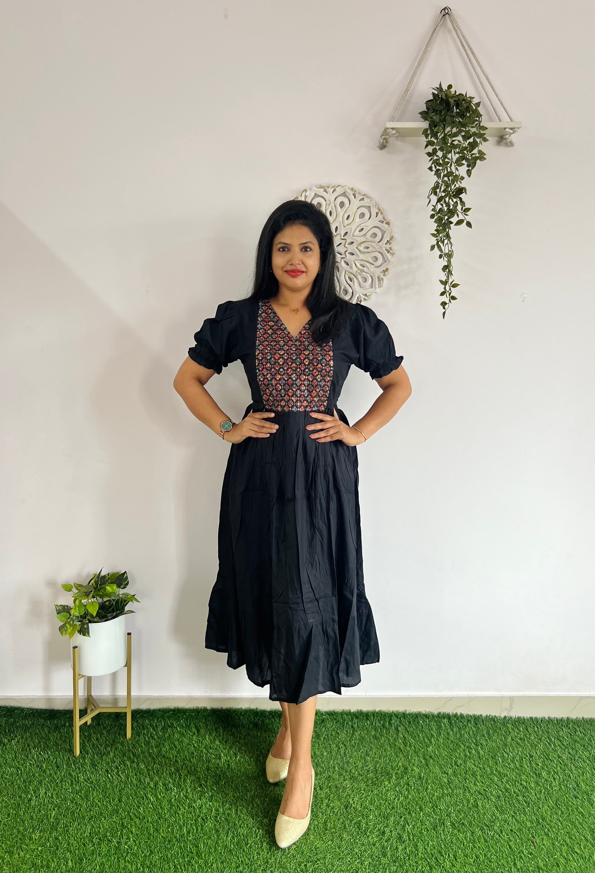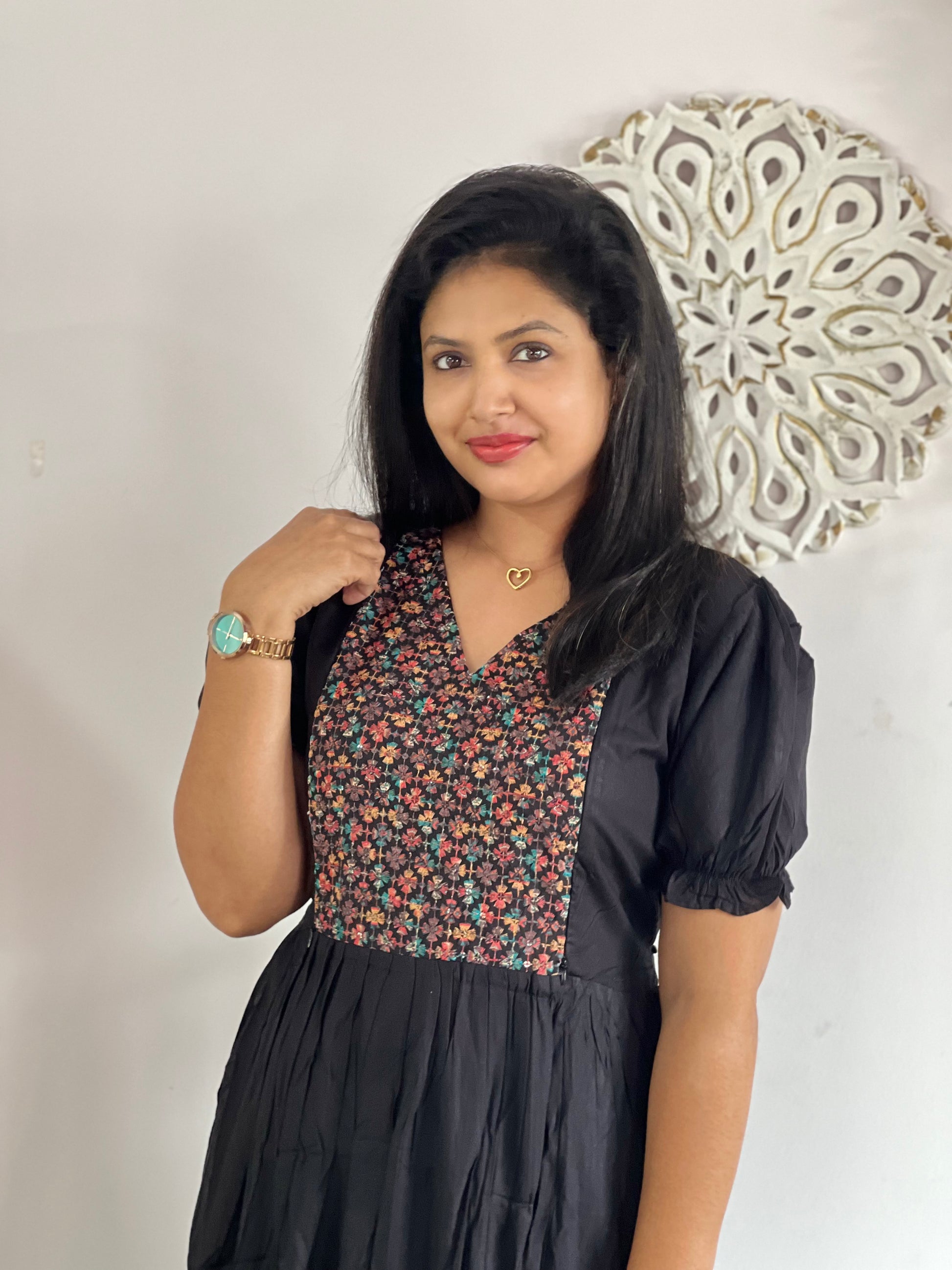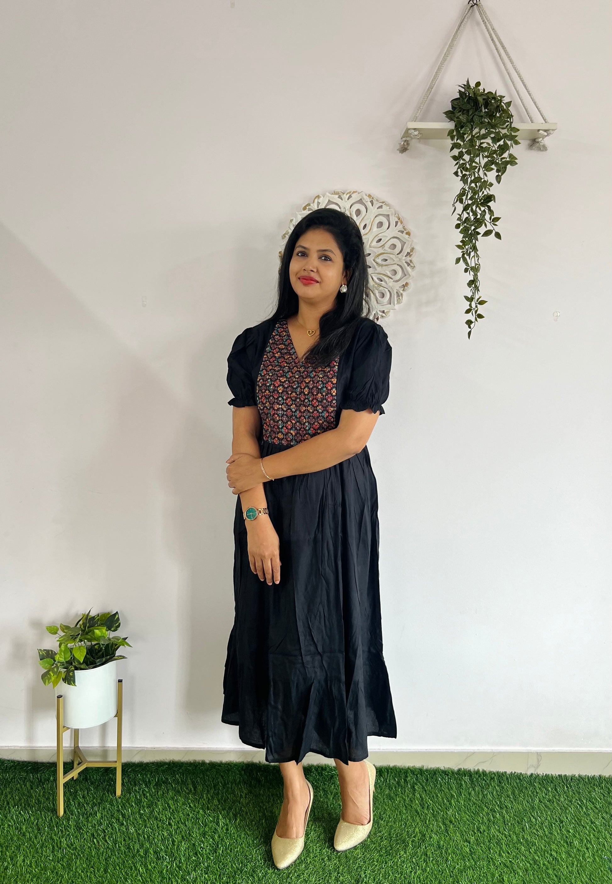 Rayon Feeding Dress with feeding zips on both sides with puff sleeves and with thread embroidery on yoke