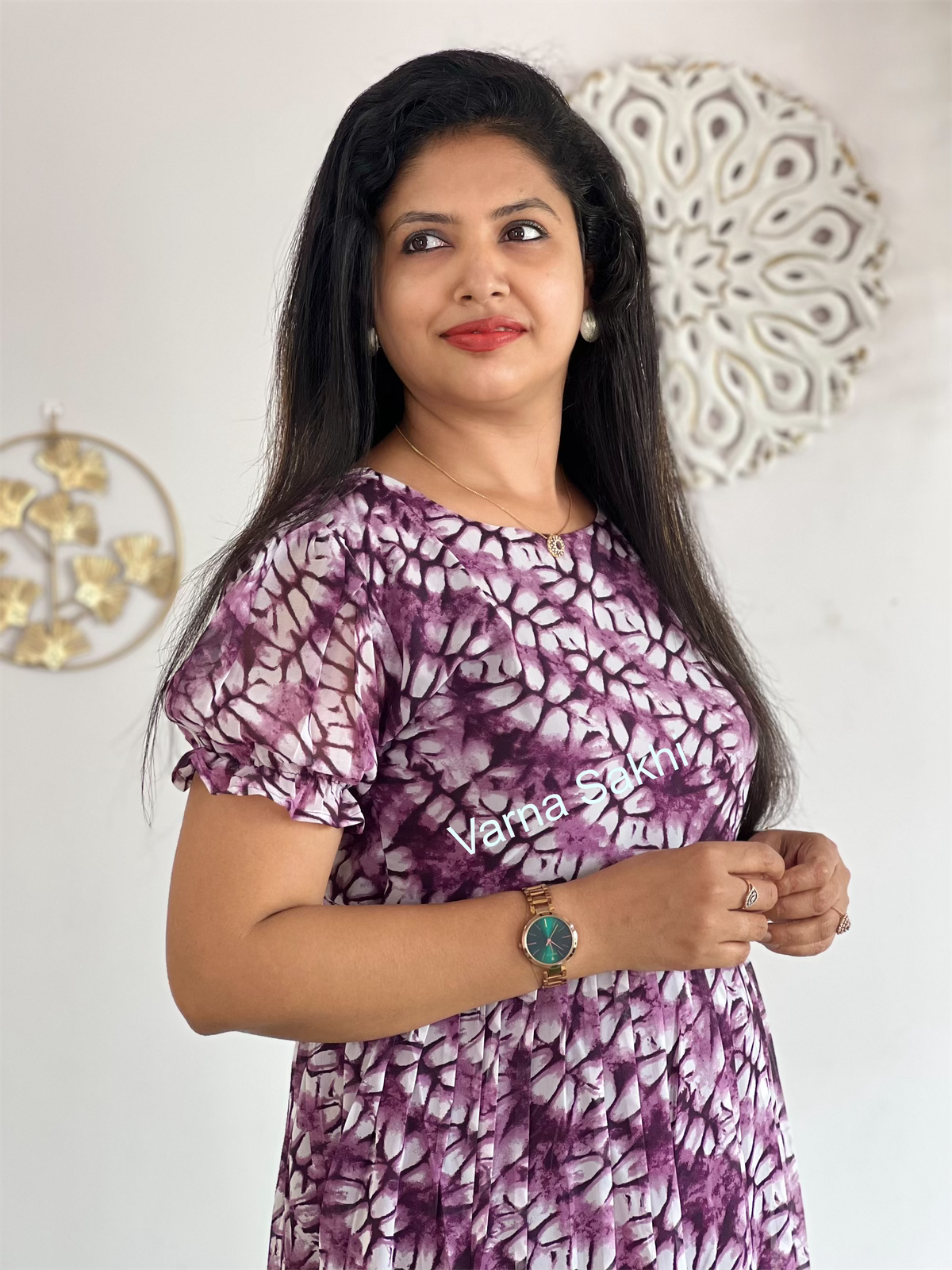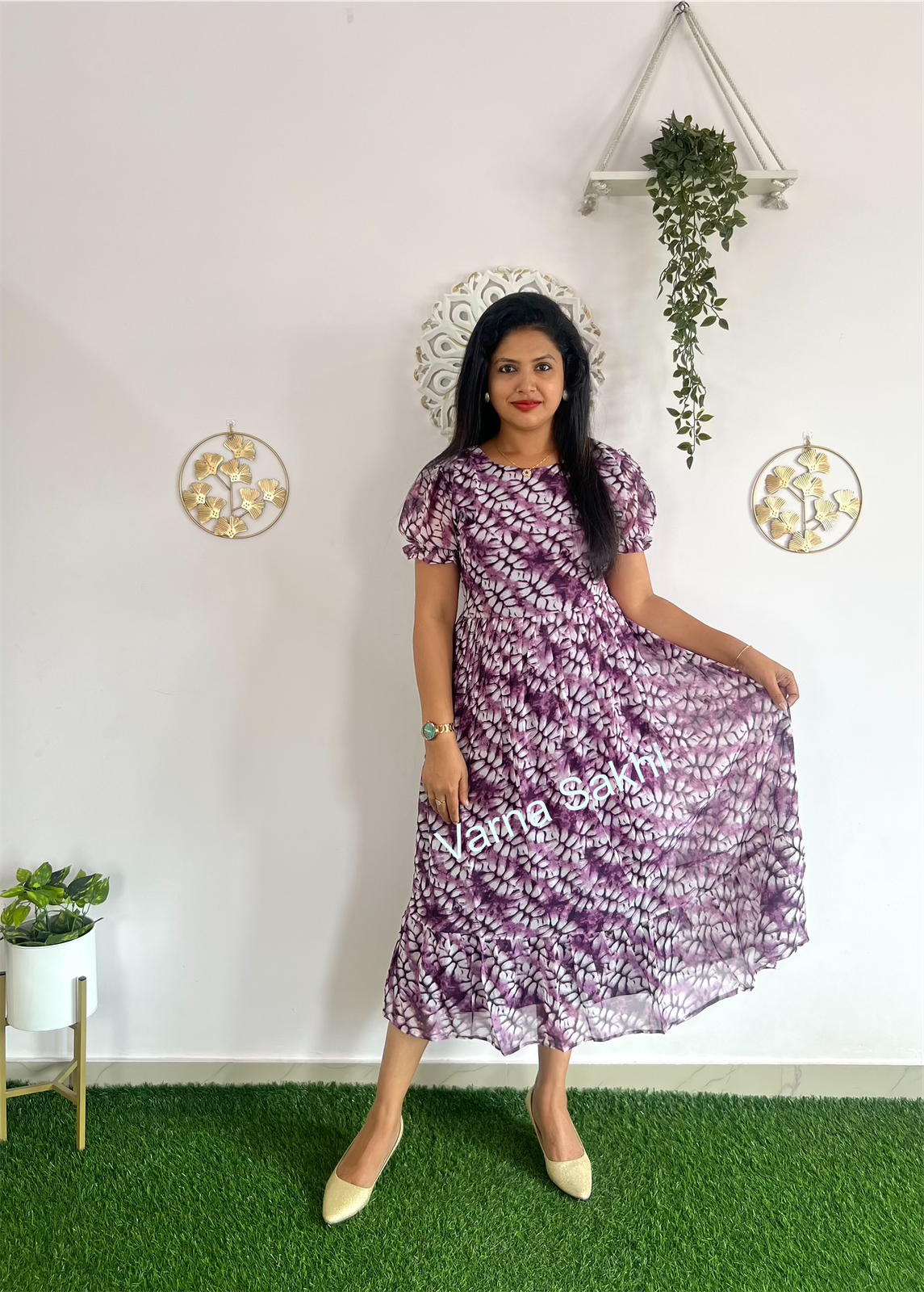 Georgette Dress with lining short puff sleeves and back knot