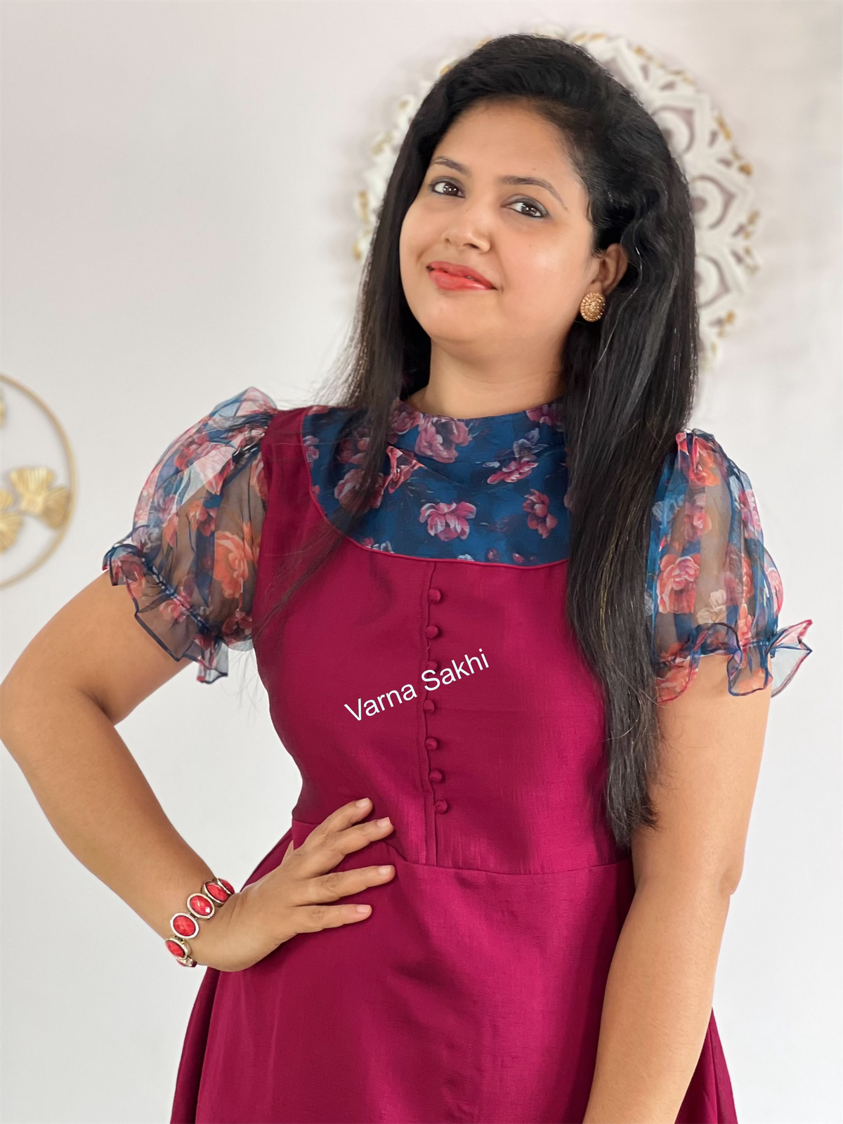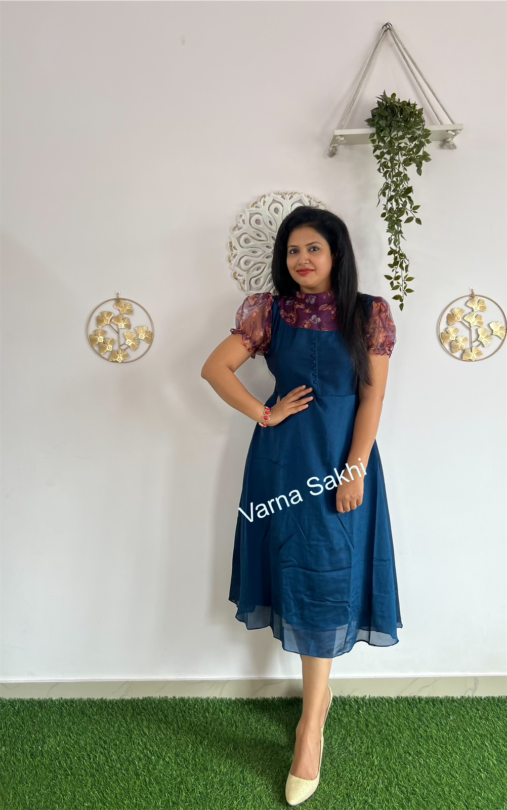 Vichitra Silk Dress with Organza High Neck and short puff sleeves,with lining, back zip and back knot
