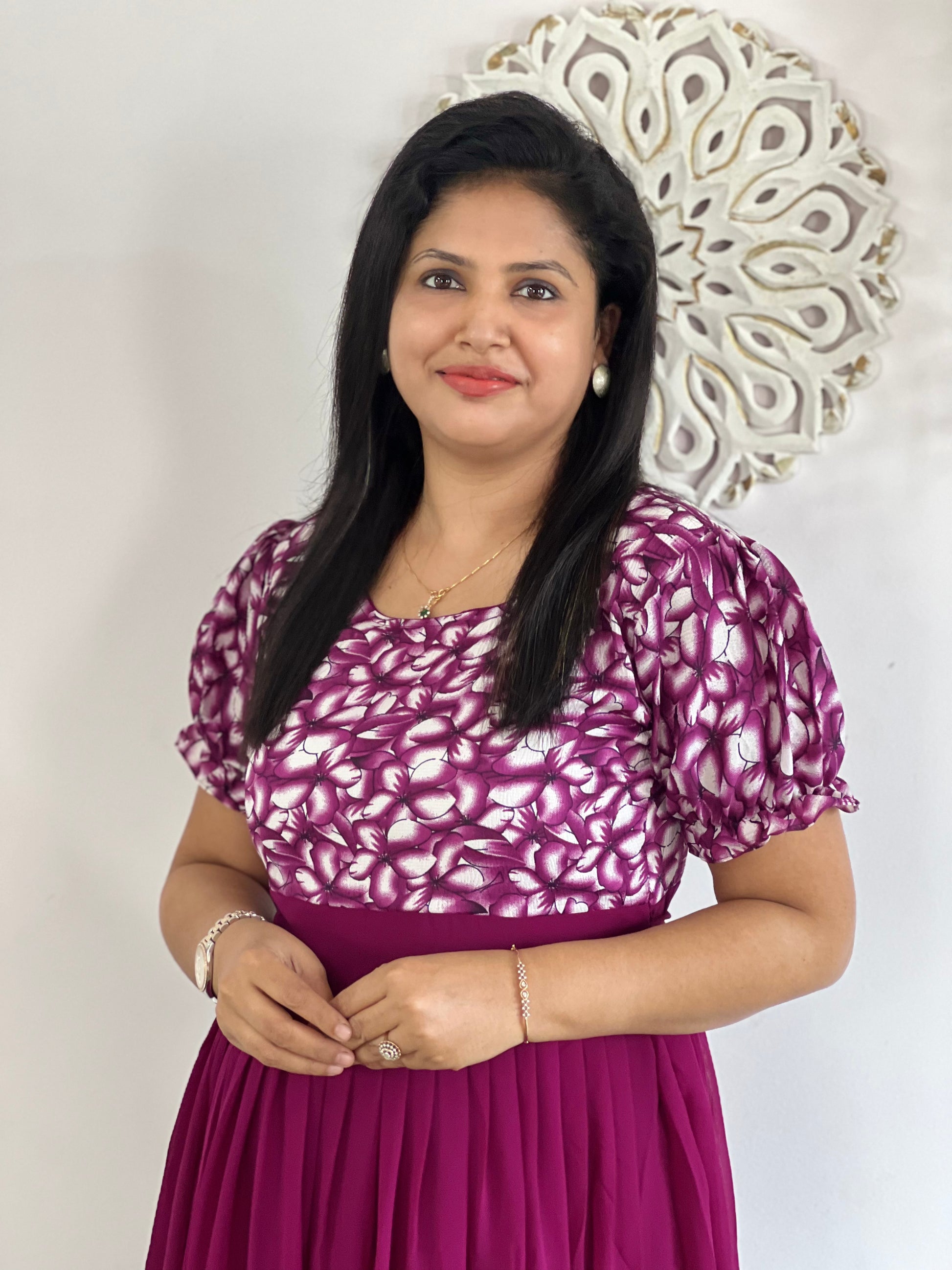 Georgette Midi Dress with double layered girl on hem,short puff sleeves and with lining