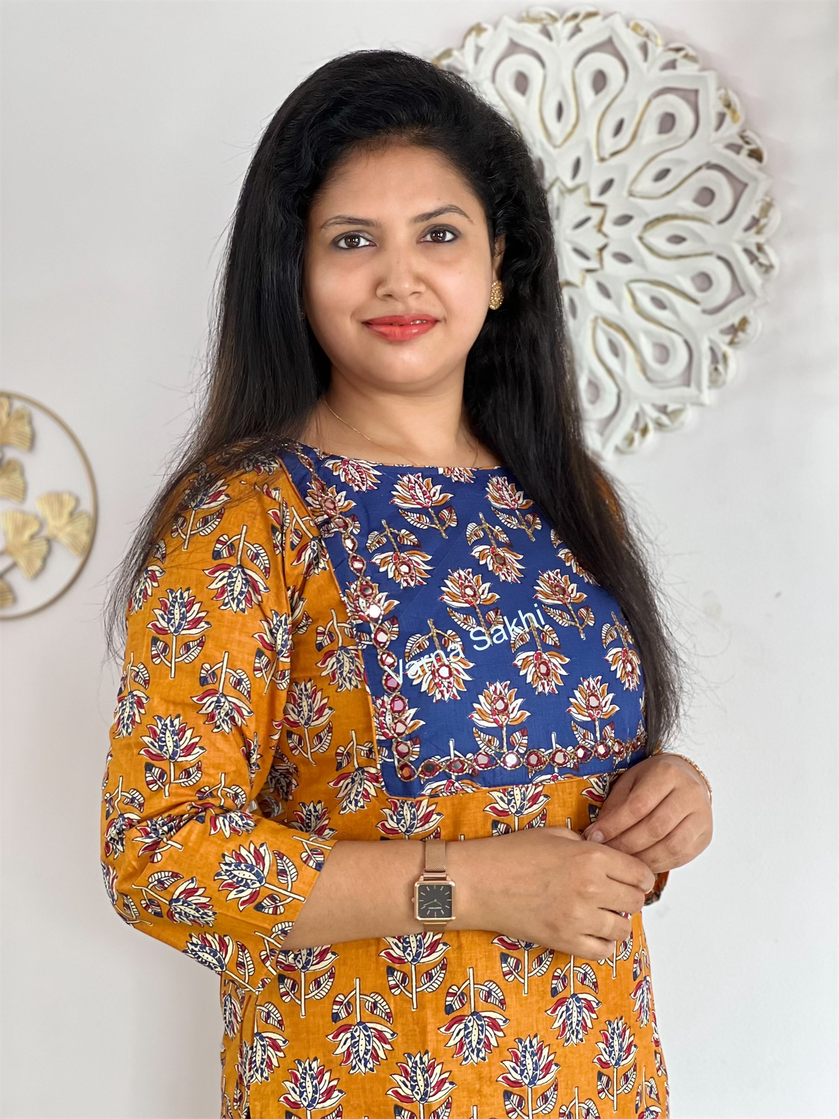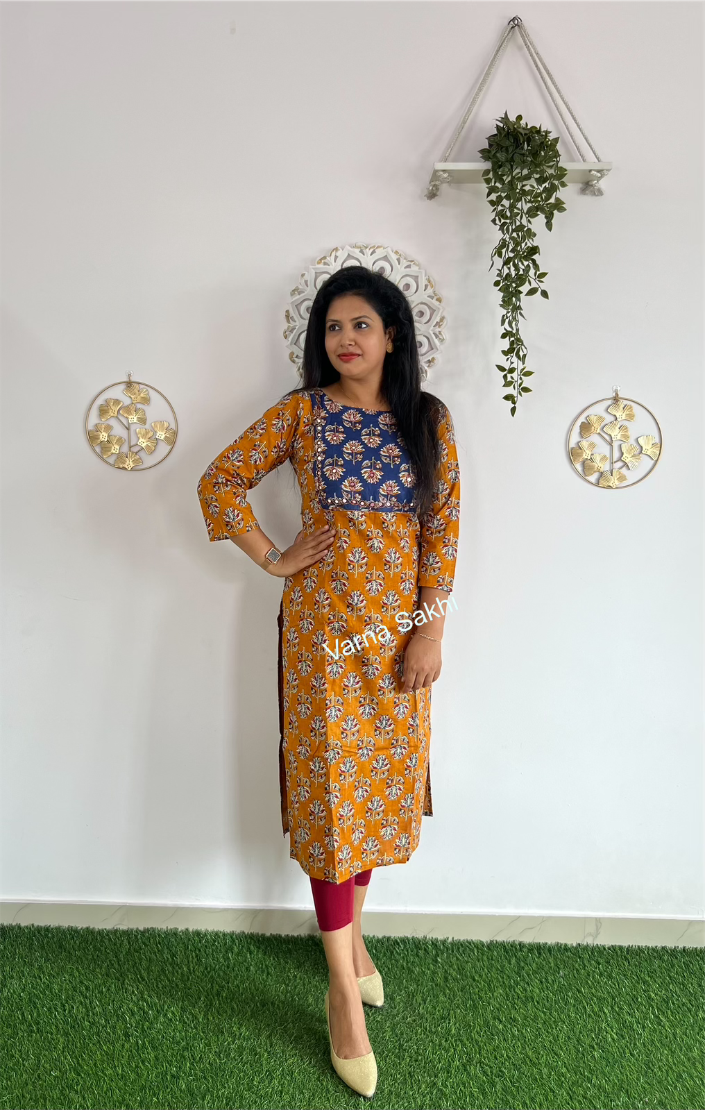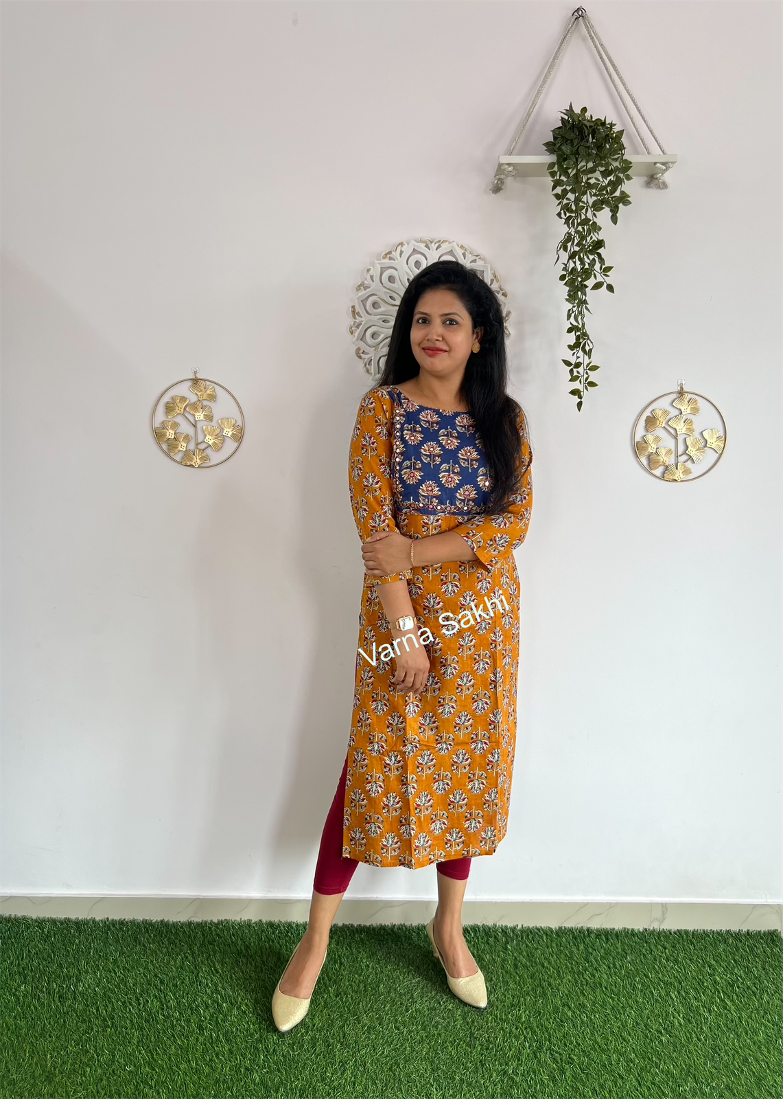 Cotton straight cut kurta with ajrakh patch work yoke with handwork and with lining
