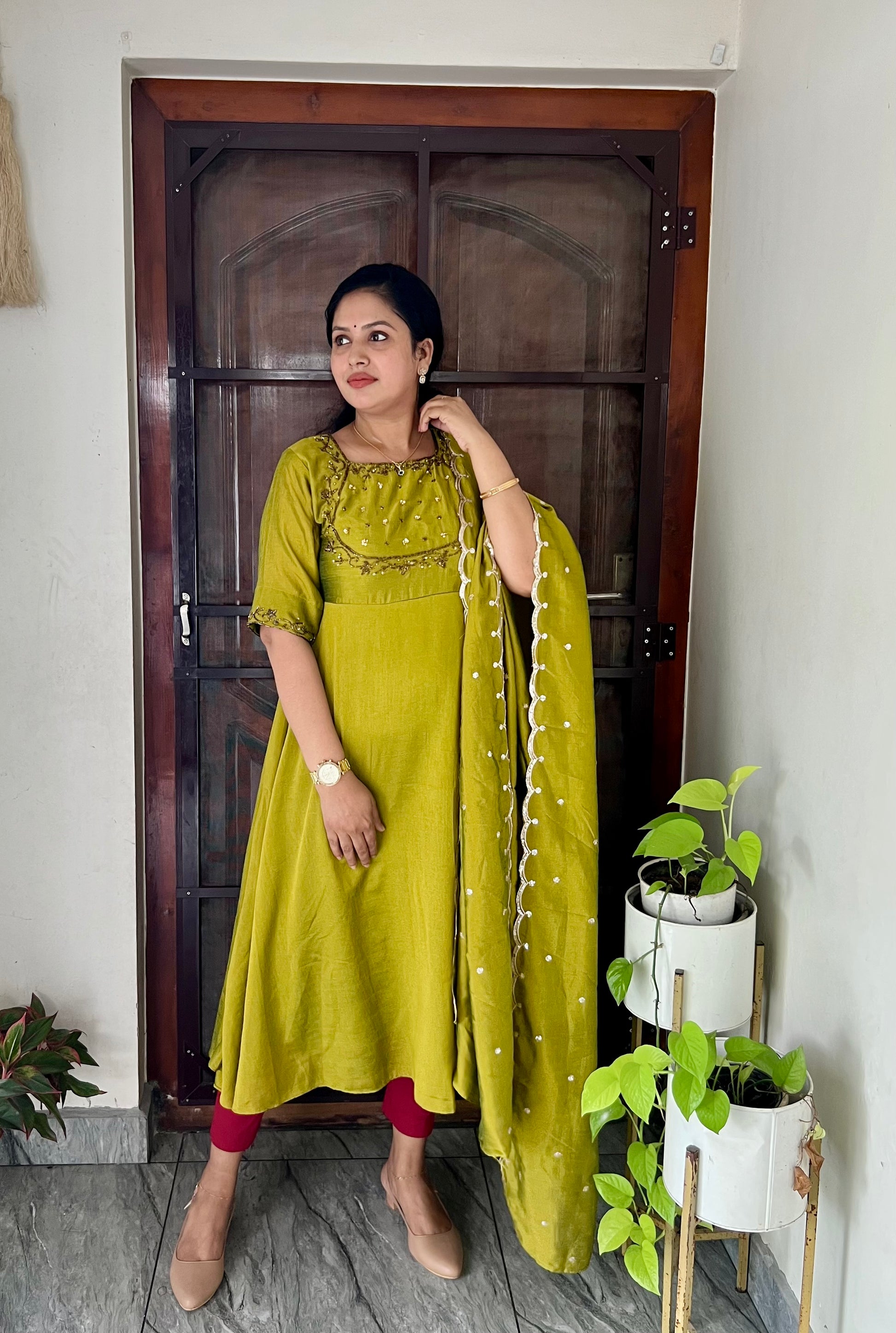 Vichitra Silk umbrella cut Kurta with heavy embroidery on yoke and sleeve ends,with elbow sleeves and with crepe lining and with Duppatta