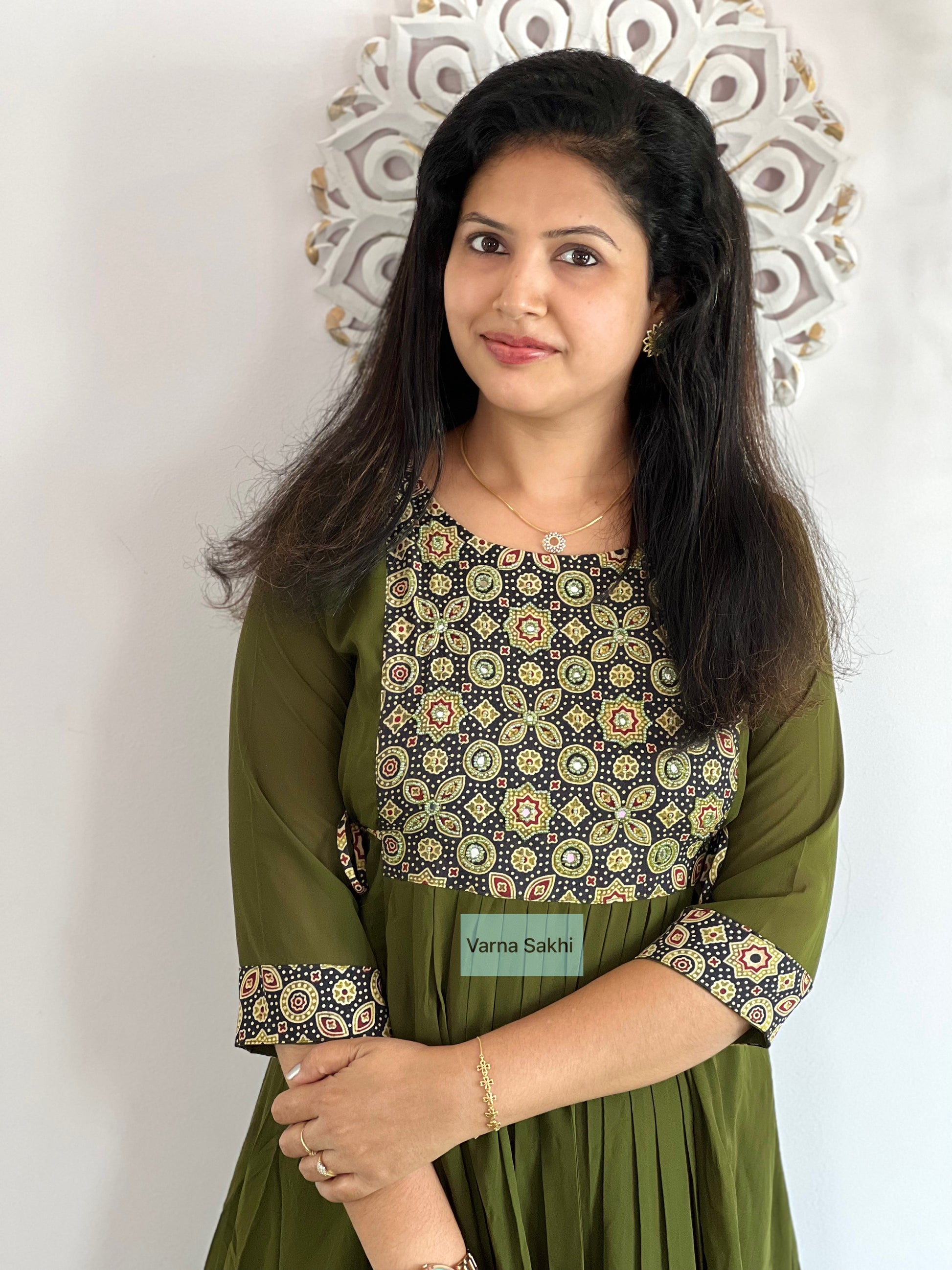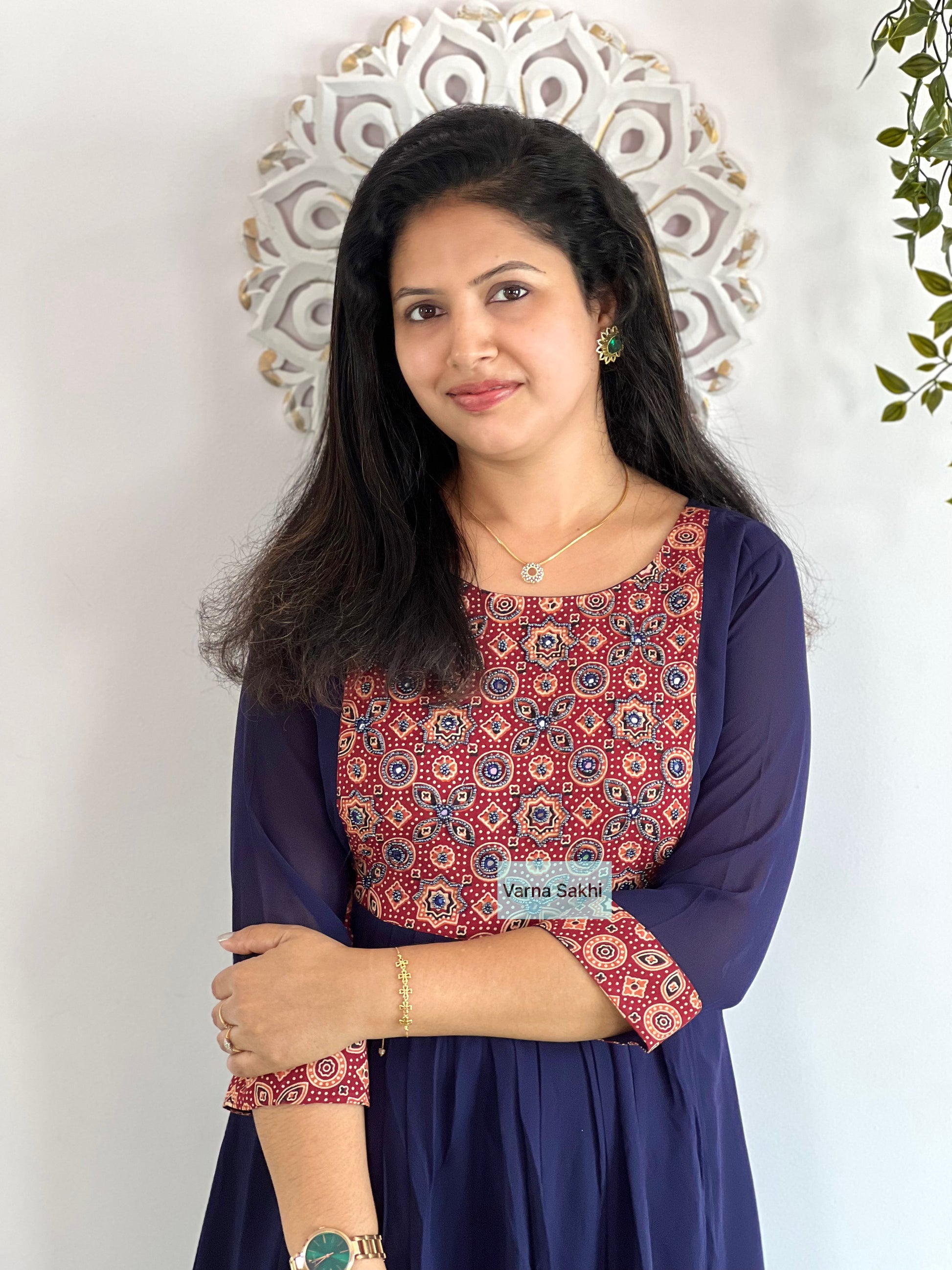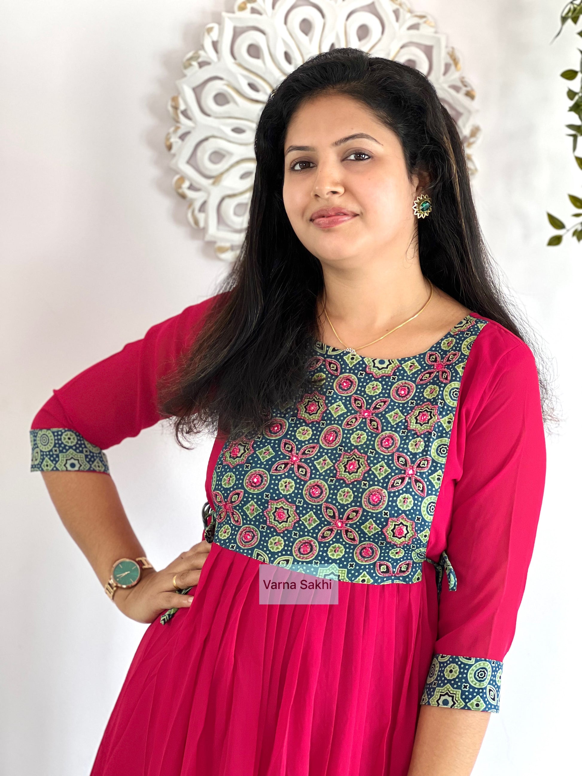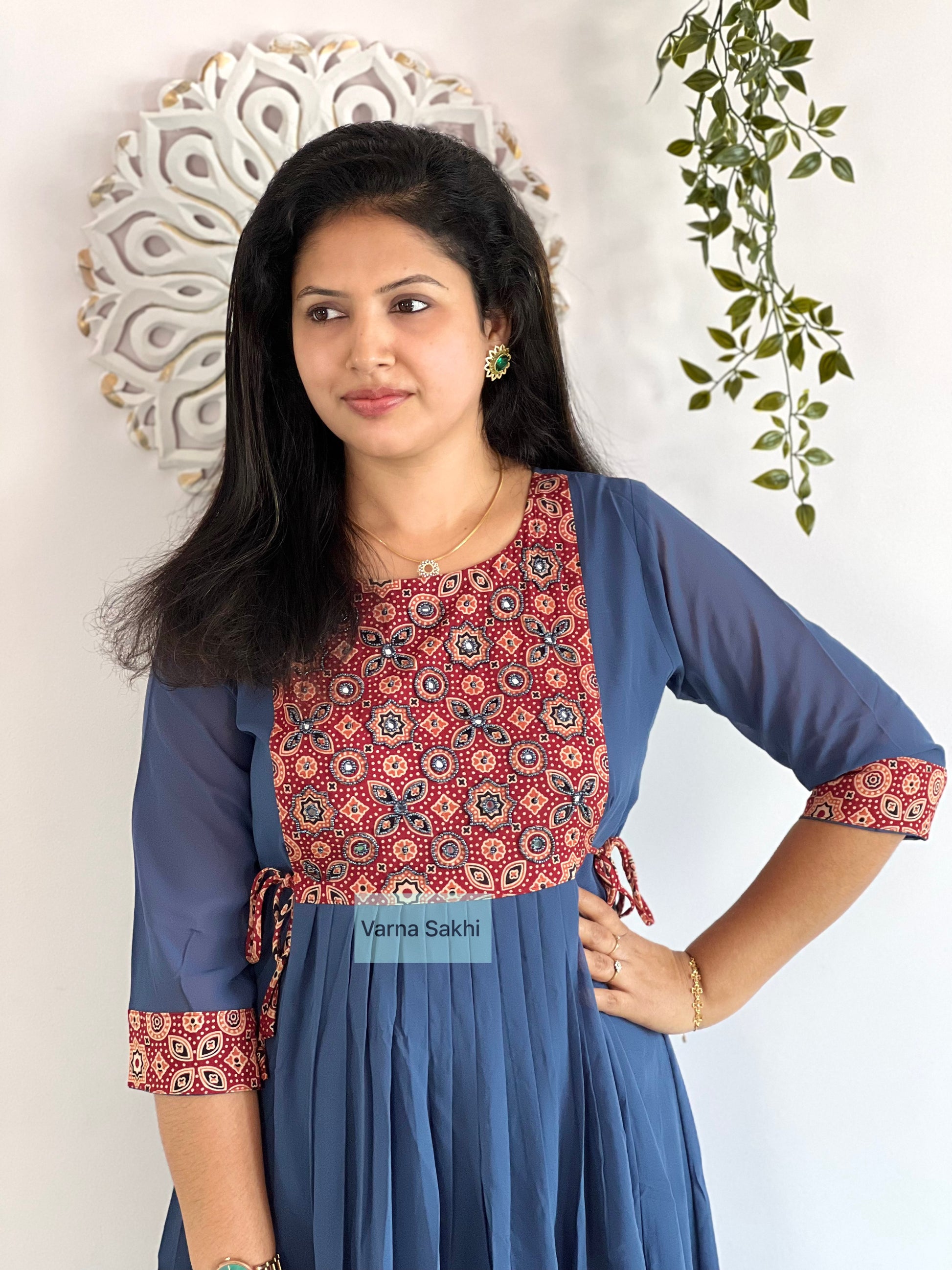 Georgette Dress with cotton ajrakh printed yoke, handwork on yoke with lining on body, not on sleeves..side knot present