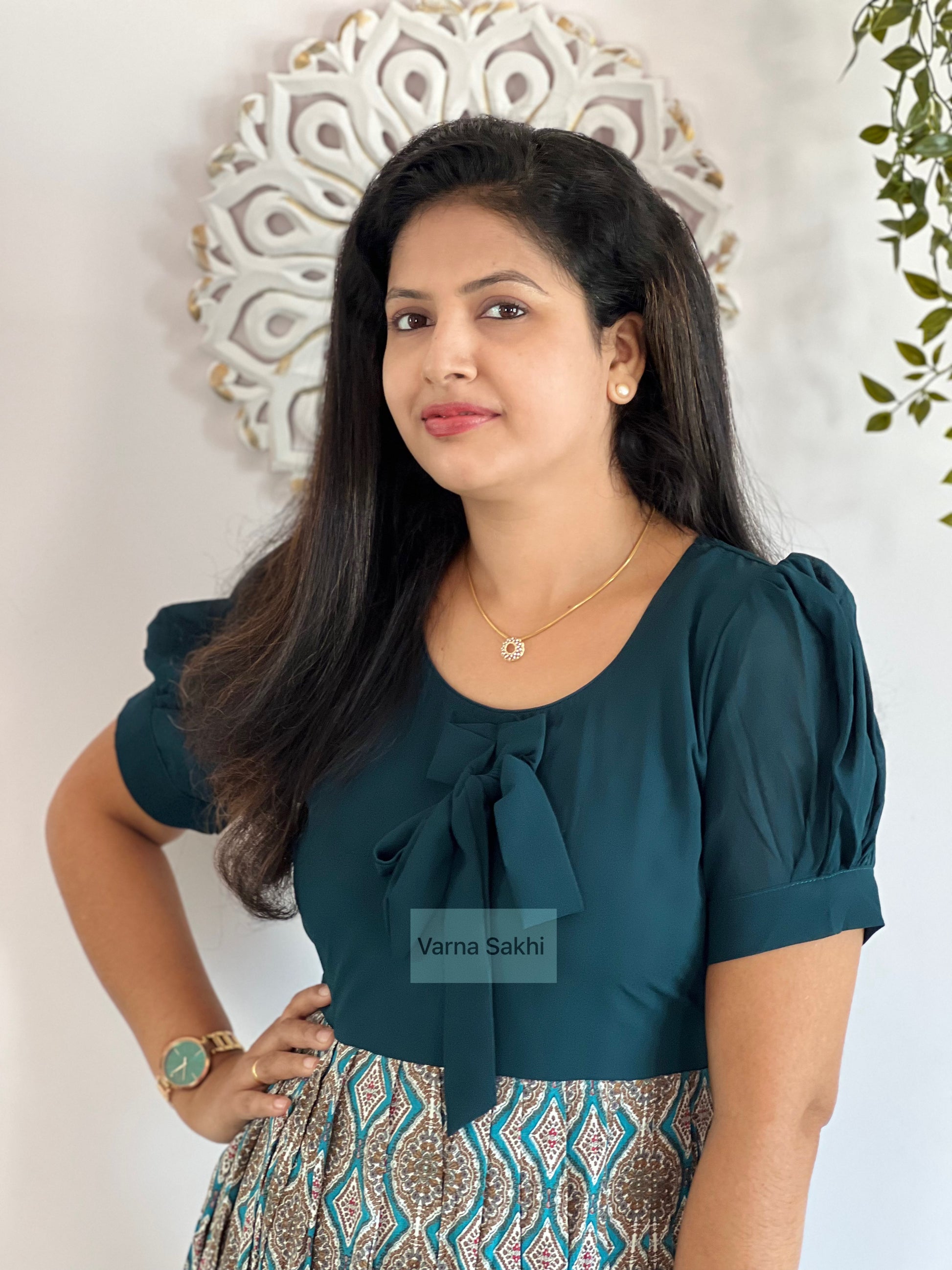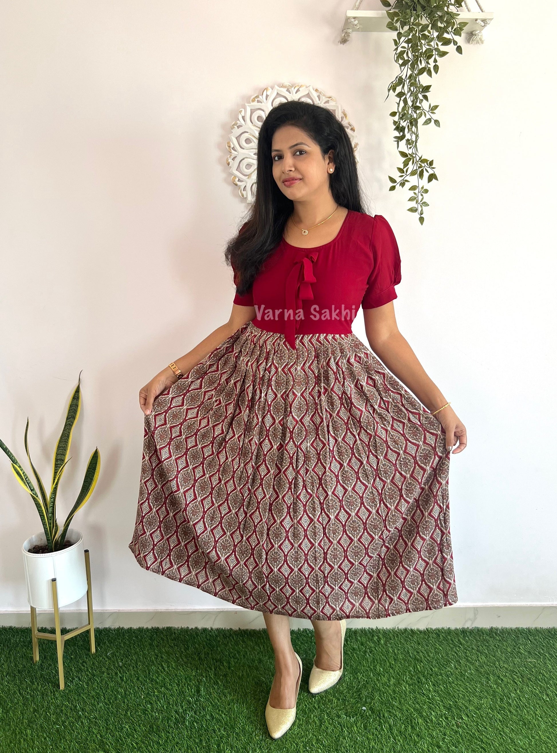 Georgette and Wrinkle Rayon mix dress with short puff sleeves and back knot