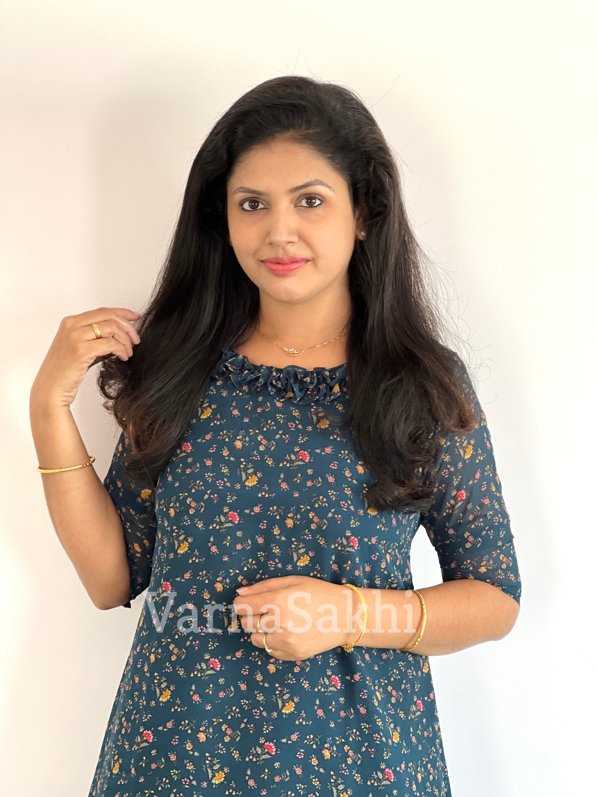 A-Line Georgette Dress with Asymmetrical hem line with ruffles on neckline  and lining present on body, not on Sleeves